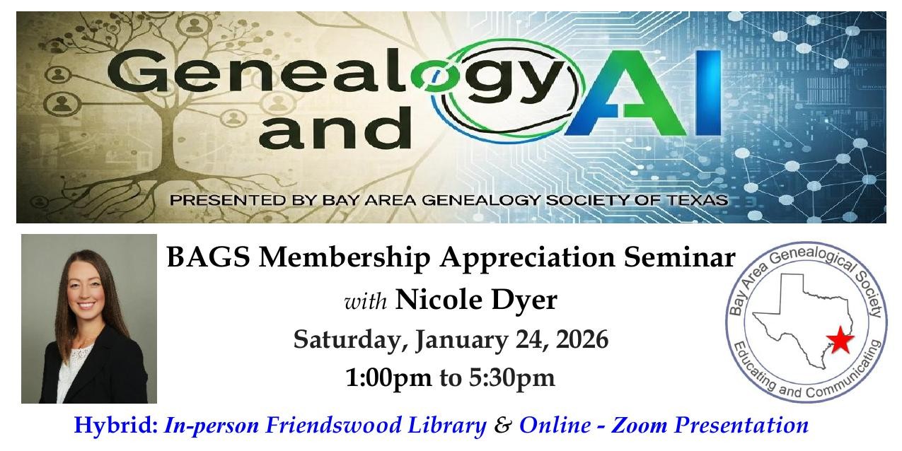 BAGS members are hosting weekly and monthly online roundtable discussions as well as in-person meetings on select dates at the Friendswood Family History Center (Bring your own laptop and use their WiFi to access locked records or use one of their six available computers.)